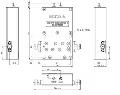 The ERZ-HPA-0200-1800-30-E is a Wideband Power Amplifier providing an outputpower of 30 dBm and a gain of 45 dB.
