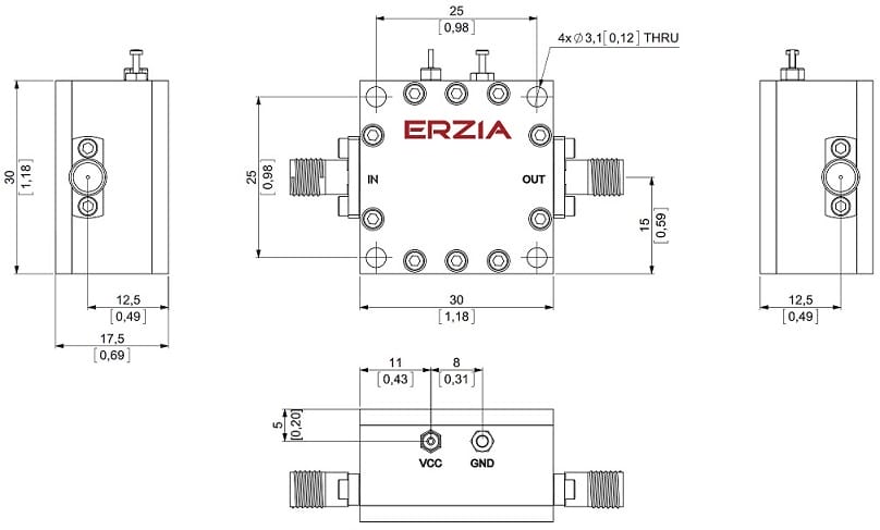 The ERZ-HPA-1700-2400-34 is a High Power Amplifier providing an output power of 34 dBm and a gain of 22 dB. The compact size and modularity makes it ideal for a wide range of applications