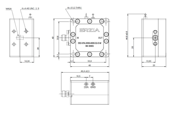 The ERZ-HPA-3000-4000-32-E-W is a High Power Amplifier providing an output power of 33 dBm and a gain of 39 dB. The compact size and modularity makes it ideal for a wide range of applications.