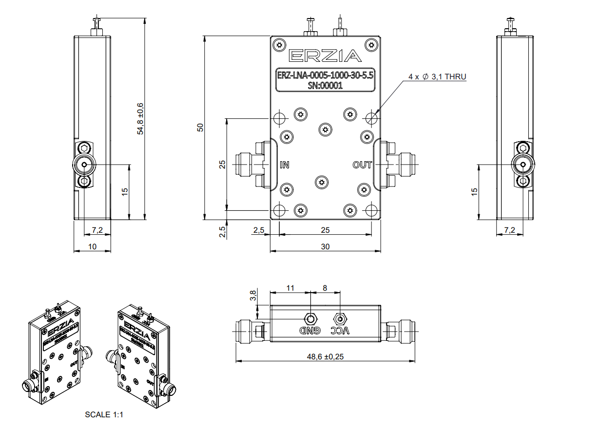 The ERZ-LNA-0005-1000-30-5.5 is a Low Noise Amplifier providing a noise figure of 5 dB and gain of 31 dB. The compact size and modularity makes it ideal for a wide range of applications.