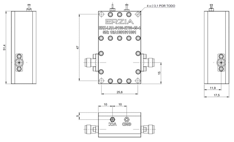 The ERZ-LNA-0100-2700-45-4 is a Low Noise Amplifier providing a gain of 45 dB with a noise figure of 4 dB. The compact size and modularity makes it ideal for a wide range of applications.
